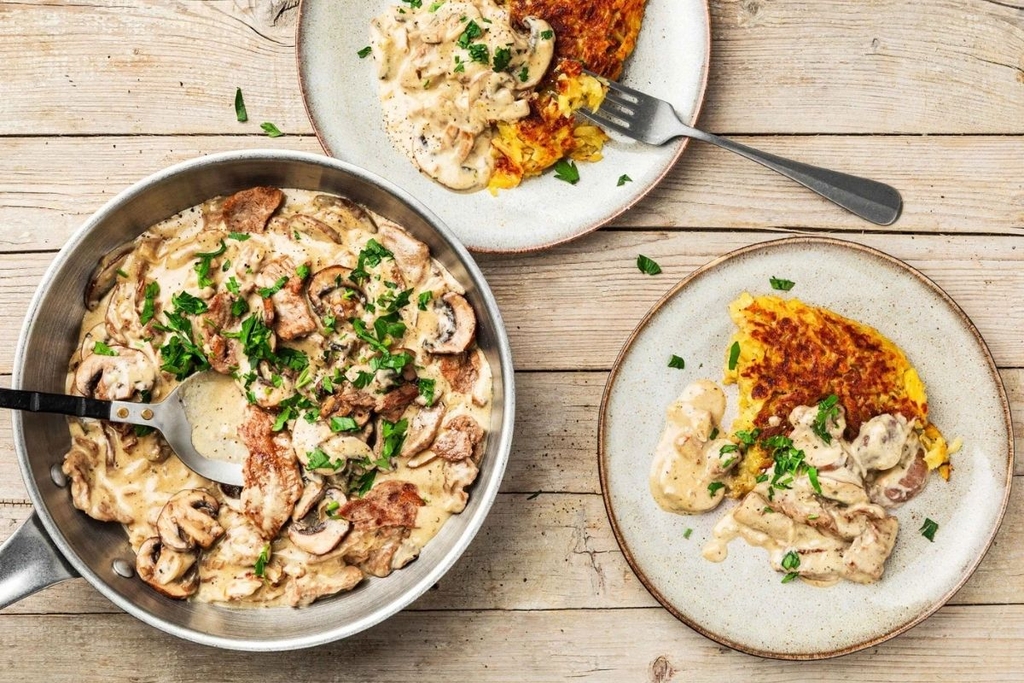 Thịt bê thái lát mỏng được xào nhanh với nấm, hành tây, sau đó phủ một lớp sốt kem béo ngậy, đậm đà. Món này thường được dùng kèm với Rösti hoặc cơm nghệ tây, mang đến một bữa ăn thịnh soạn và đầy hương vị.