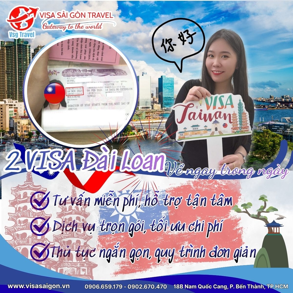 0906659179Không chỉ là Trung Quốc, Macao hay Hàn Quốc, hôm nay VISA SÀI GÒN xin tự hào thông báo đã có thêm hai khách hàng thân yêu khác đã chính thức nhận được tấm vé mở ra cánh cửa đến Đài Loan - Con Rồng của Châu Á!