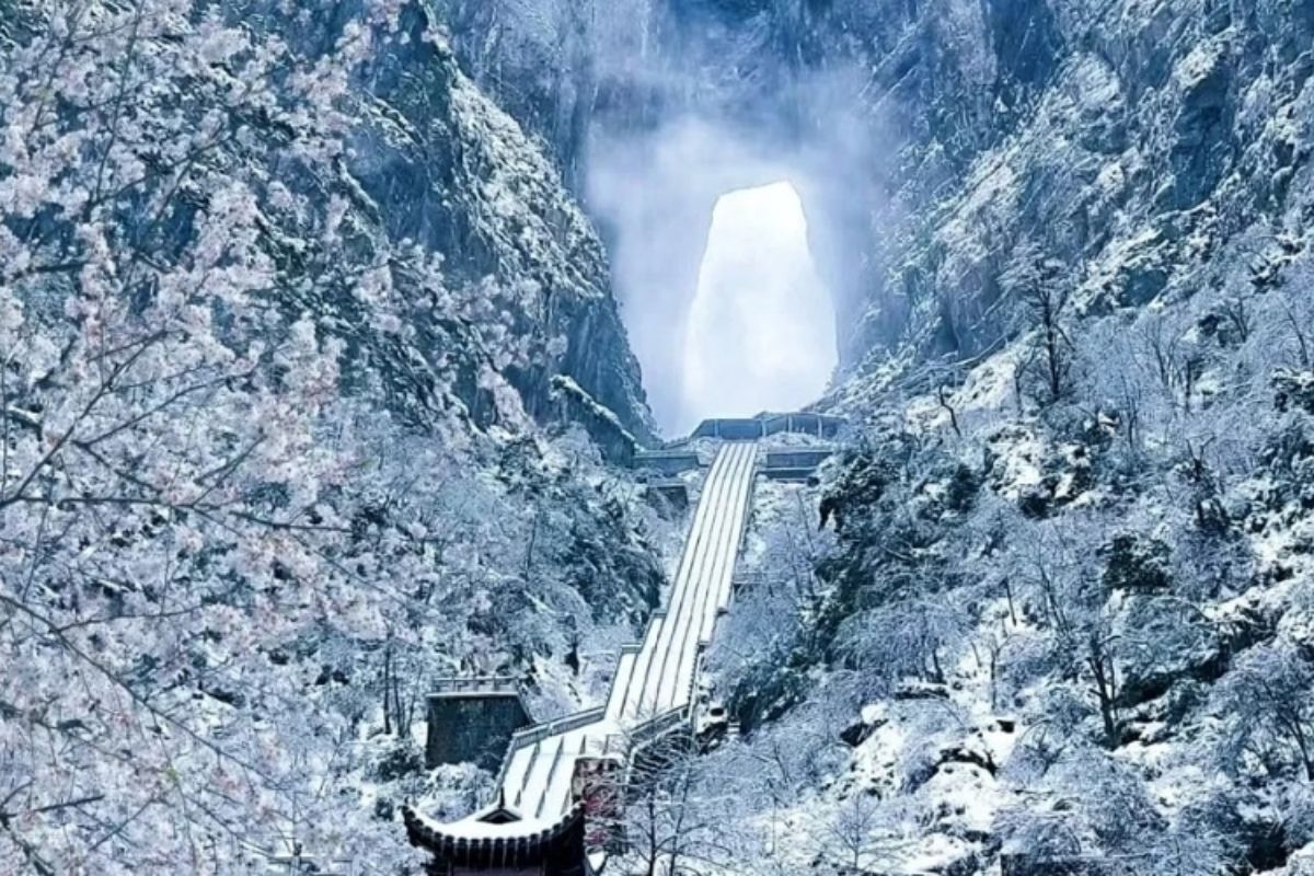 Cầu Kính Thiên Môn Phủ Băng. Đừng bỏ lỡ Núi Thiên Môn (Tianmen Mountain). Con đường lên Thiên Môn và đặc biệt là Cầu Kính (Glass Skywalk) sẽ trở nên thử thách và ngoạn mục hơn khi có băng tuyết bao phủ. Đi bộ giữa trời mây, ngắm nhìn con đường 99 Khúc Cua nổi tiếng dưới tuyết sẽ là một kỷ niệm khó quên.