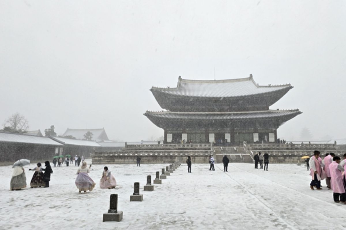 Cung điện Gyeongbokgung: Vẻ đẹp cổ kính của cung điện hòa quyện với tuyết trắng tạo nên một bức tranh trầm mặc, hùng vĩ.