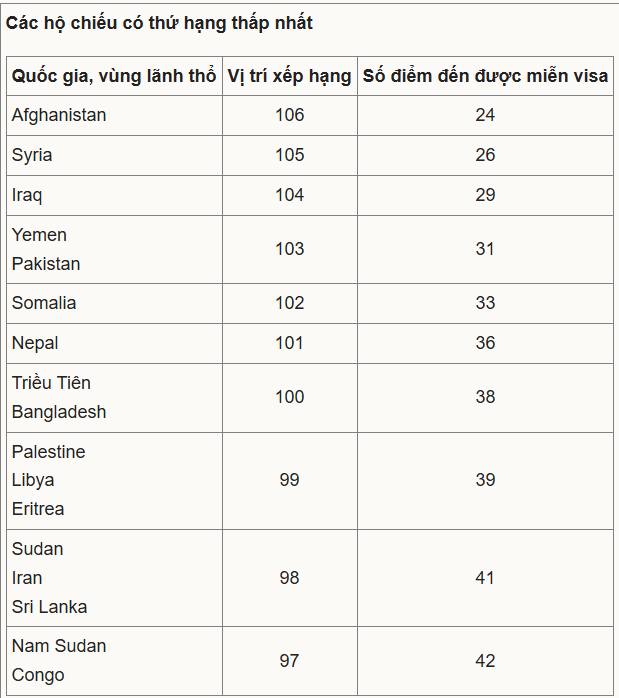 NHỮNG HỘ CHIẾU XẾP CUỐI BẢNG "QUYỀN LỰC NHẤT" THẾ GIỚI