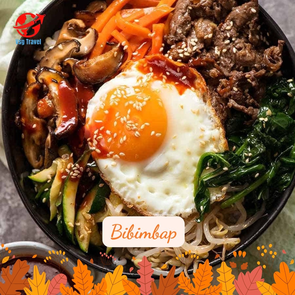 Vào mùa Lá vàng, Cơm trộn Bibimbap được nâng tầm với các loại nấm tươi theo mùa (như nấm thông, nấm hương), cà rốt, bí ngòi và đặc biệt là lá kimchi mới muối (geotjeori). Tất cả được trộn đều với tương ớt gochujang và trứng ốp la lòng đào.