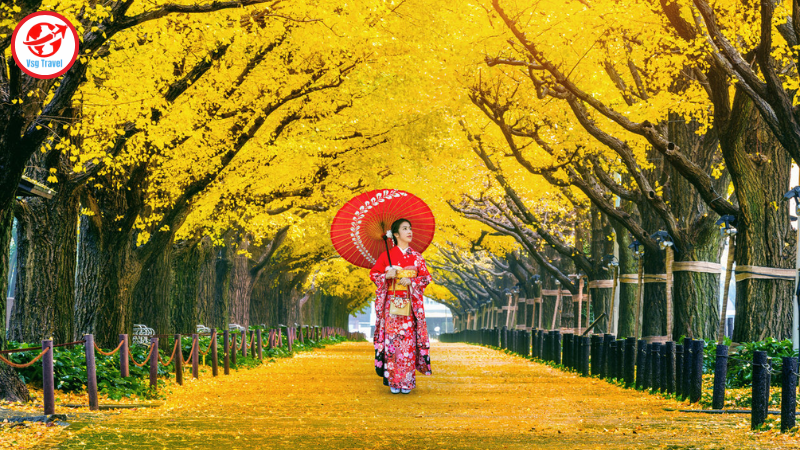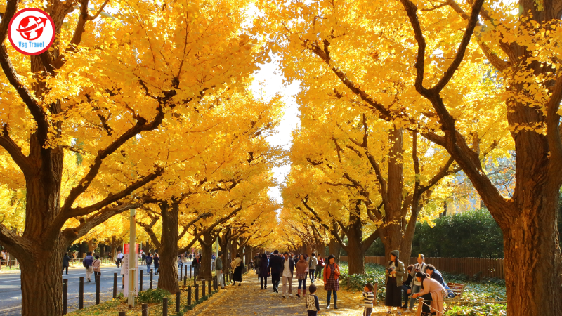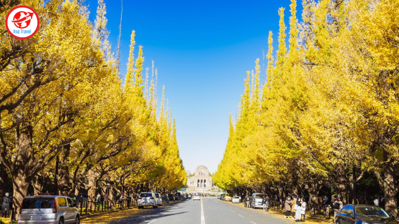 Điểm nhấn ở đây chính là hàng bạch quả (Icho) cao vút được cắt tỉa thẳng tắp, chuyển sang màu vàng tươi rực rỡ, tạo thành một "con đường vàng" kéo dài 300m vô cùng ấn tượng.