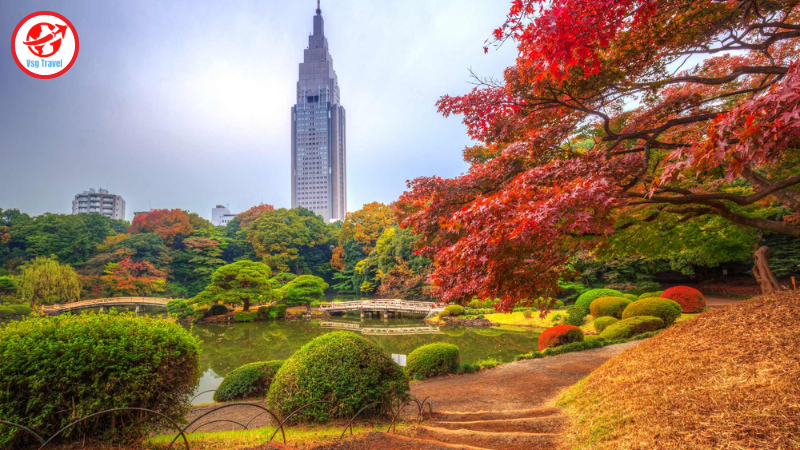 Vườn Quốc gia Shinjuku Gyoen. Nơi đây là một khuôn viên rộng lớn với sự pha trộn của vườn kiểu Nhật, kiểu Anh và kiểu Pháp. Bạn có thể chụp những cây phong Momiji đỏ rực bên cạnh bãi cỏ xanh mướt kiểu Anh.