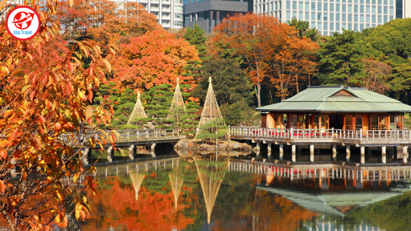 Vườn Hamarikyu Onshi. Đây là Khu vườn truyền thống kiểu Nhật, nổi bật với ao nước biển Shiori-no-ike và quán trà Nakajima-no-ochaya nổi trên mặt nước. Chụp phản chiếu của cây lá đỏ, bạch quả trên mặt hồ. Tạo hình ảnh mang đậm chất Nhật Bản khi chụp lá đỏ với quán trà truyền thống làm tiền cảnh.